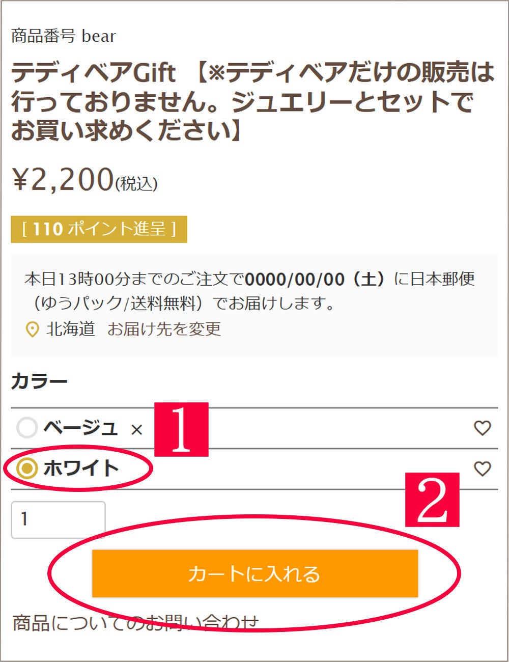 【Step1】 ご希望のカラーを1⃣よりご選択頂き、2⃣「カートに入れる」をタップしてください。