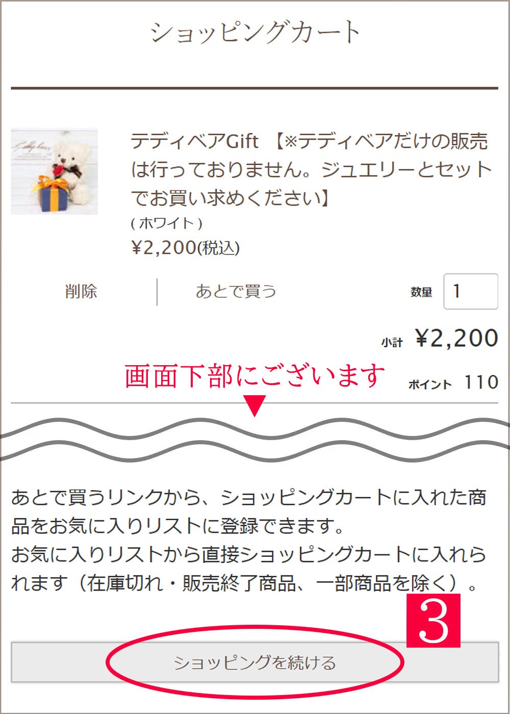 【Step2】 カートの中身をご確認頂き、3⃣「ショッピングを続ける」をタップしてください。
