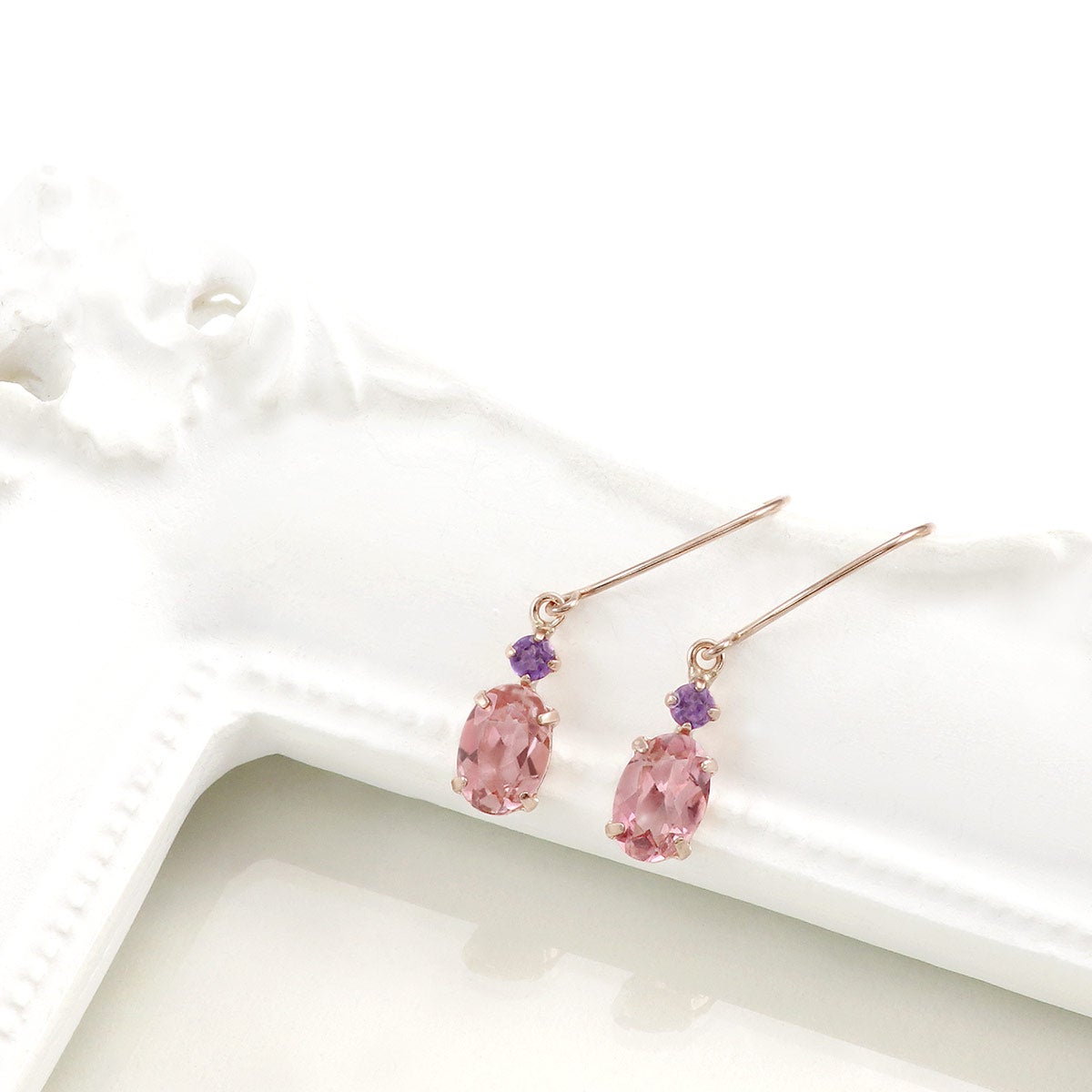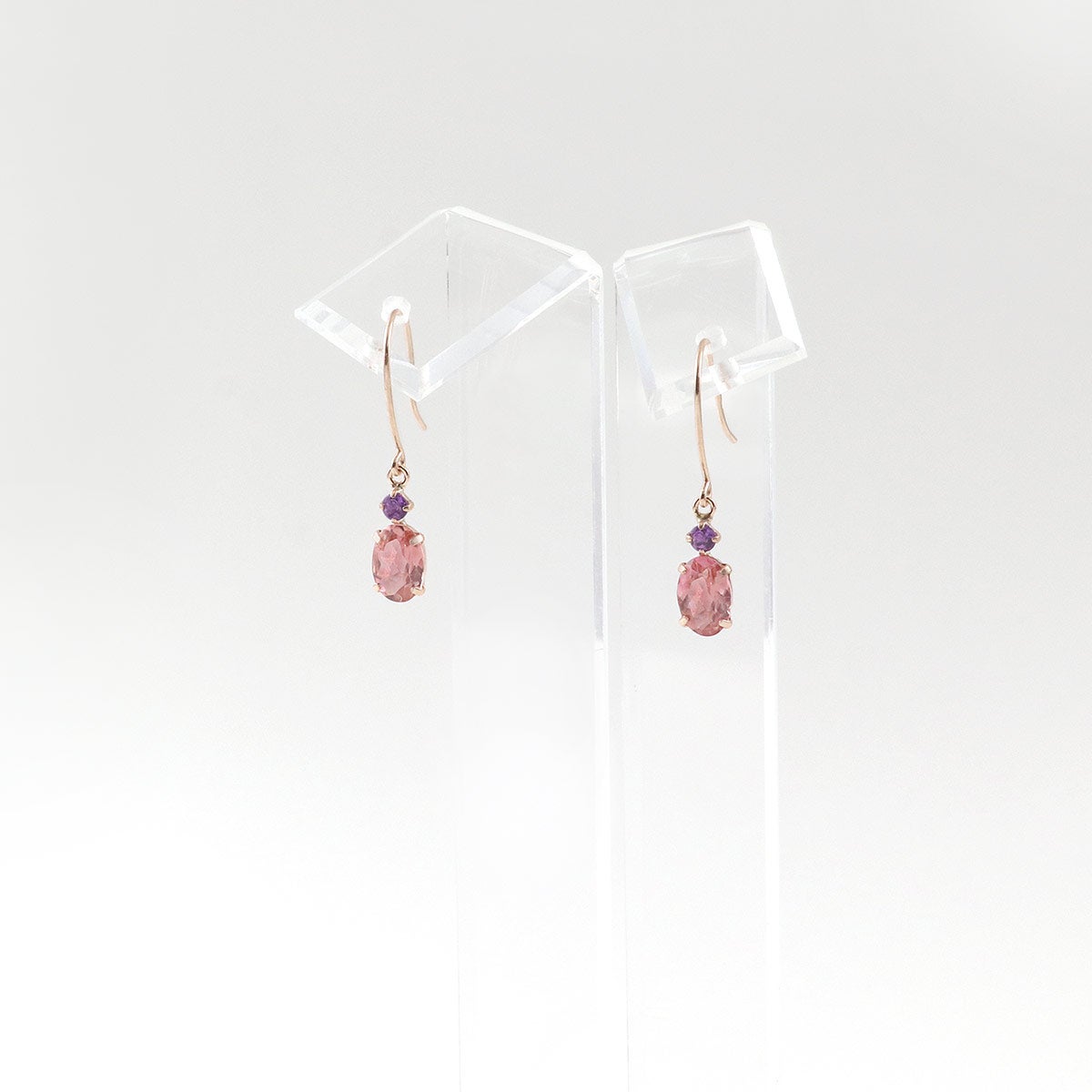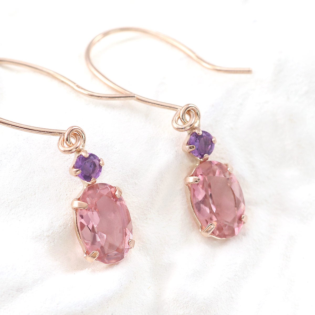 10金ピンクゴールドの地金に、オーバルカットのピンクトルマリンとラウンドカットのアメジストを合わせたピアスです。