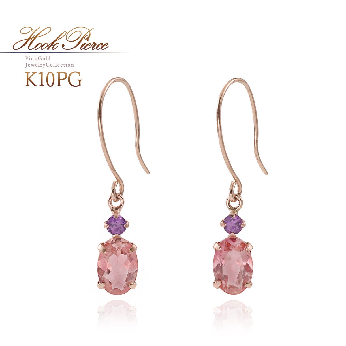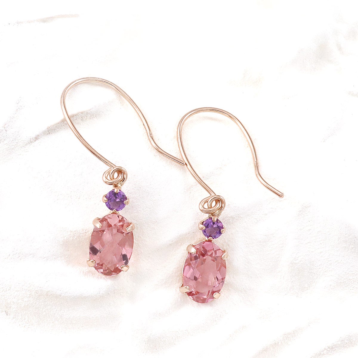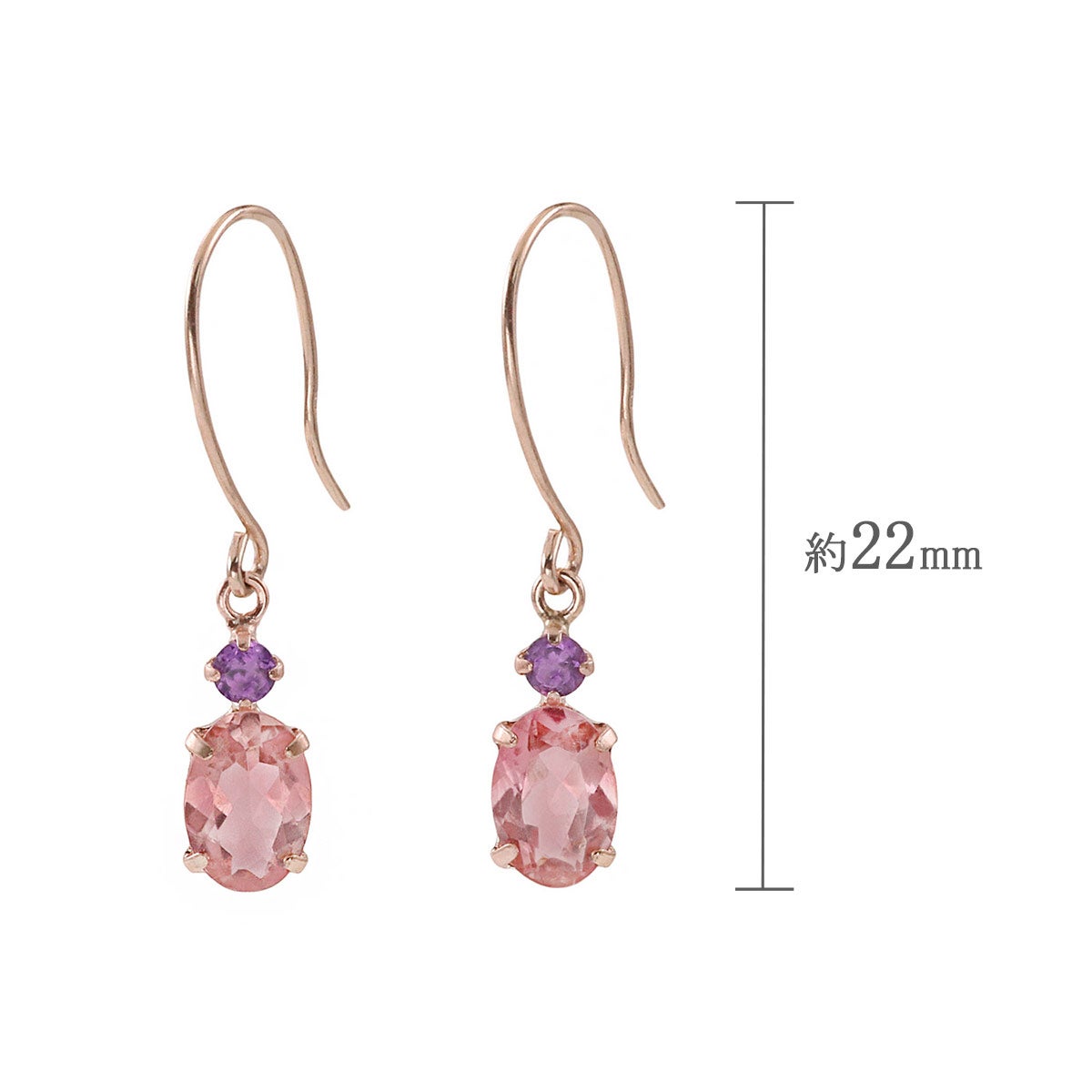 10金ピンクゴールドの地金に、オーバルカットのピンクトルマリンとラウンドカットのアメジストを合わせたピアスです。