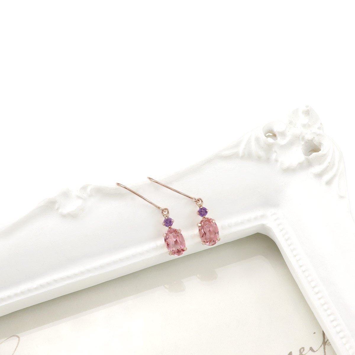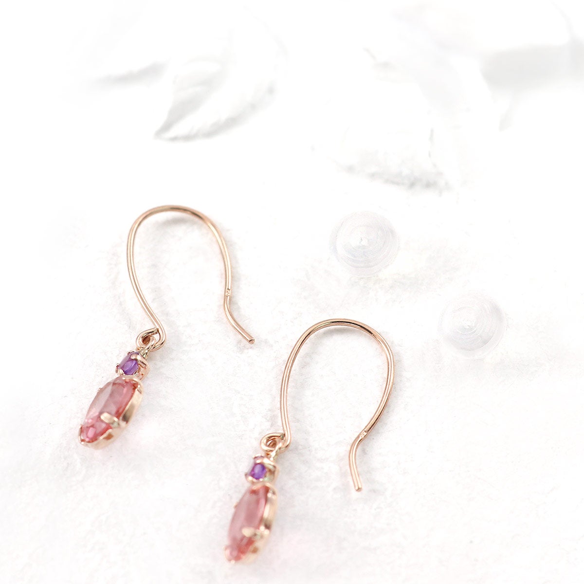 高貴で上品なイメージを持つ紫色の「アメジスト」と愛らしい華やかさを放つ「ピンクトルマリン」が、大人可愛く、ロマンチックに耳元を飾ります。