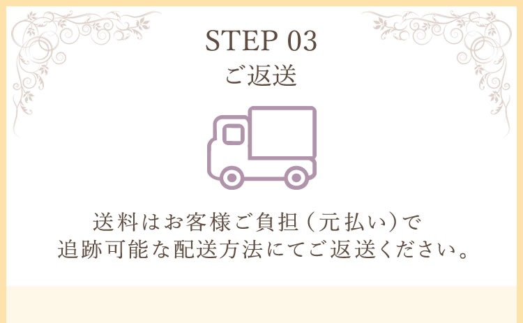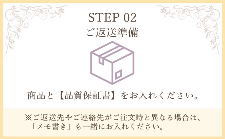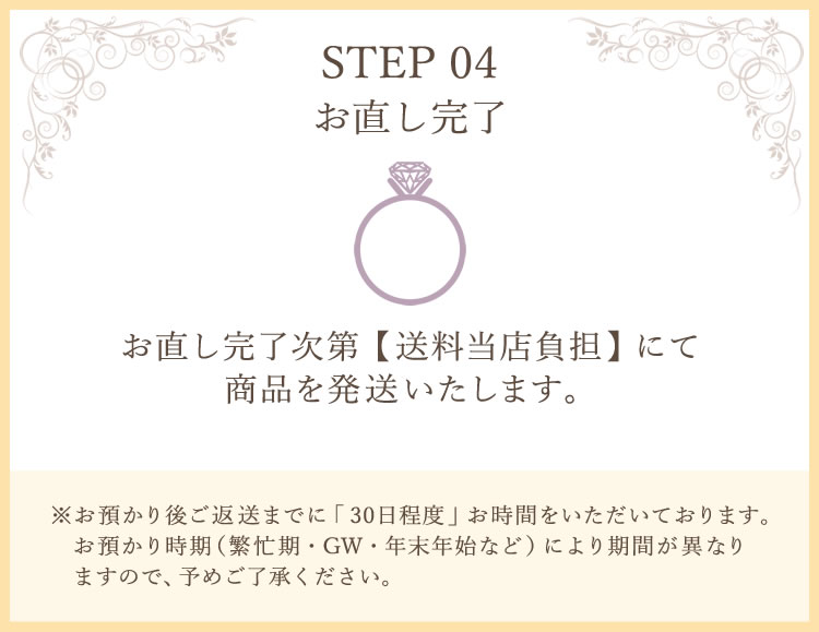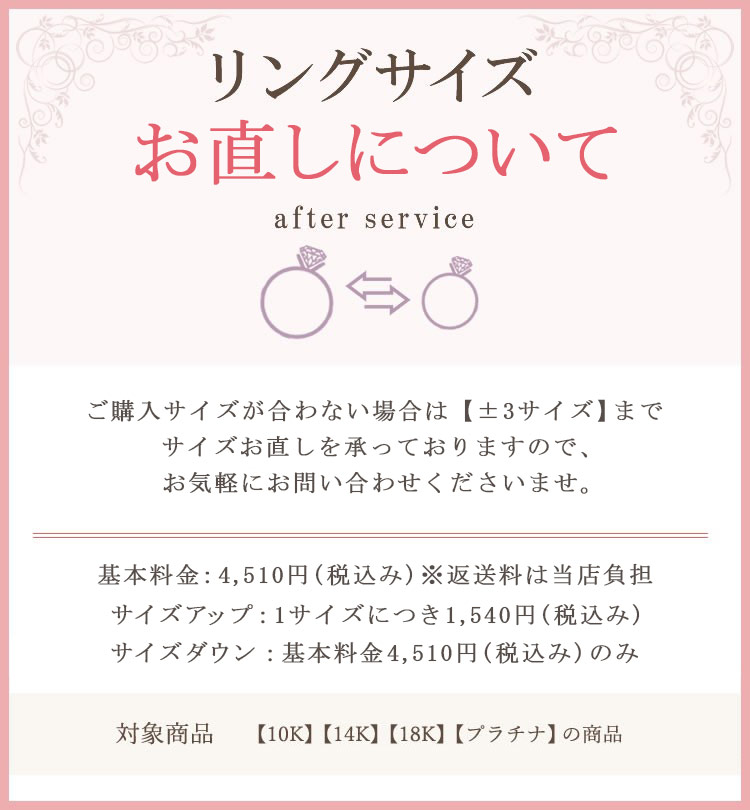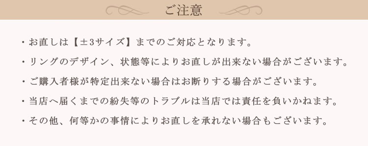 ●「メール」でのご連絡の場合 こちらから下記フォーマットを使用し、 ご連絡をお願いいたします。 ※タイトルは「リングサイズ直し希望」とご記入ください。 |